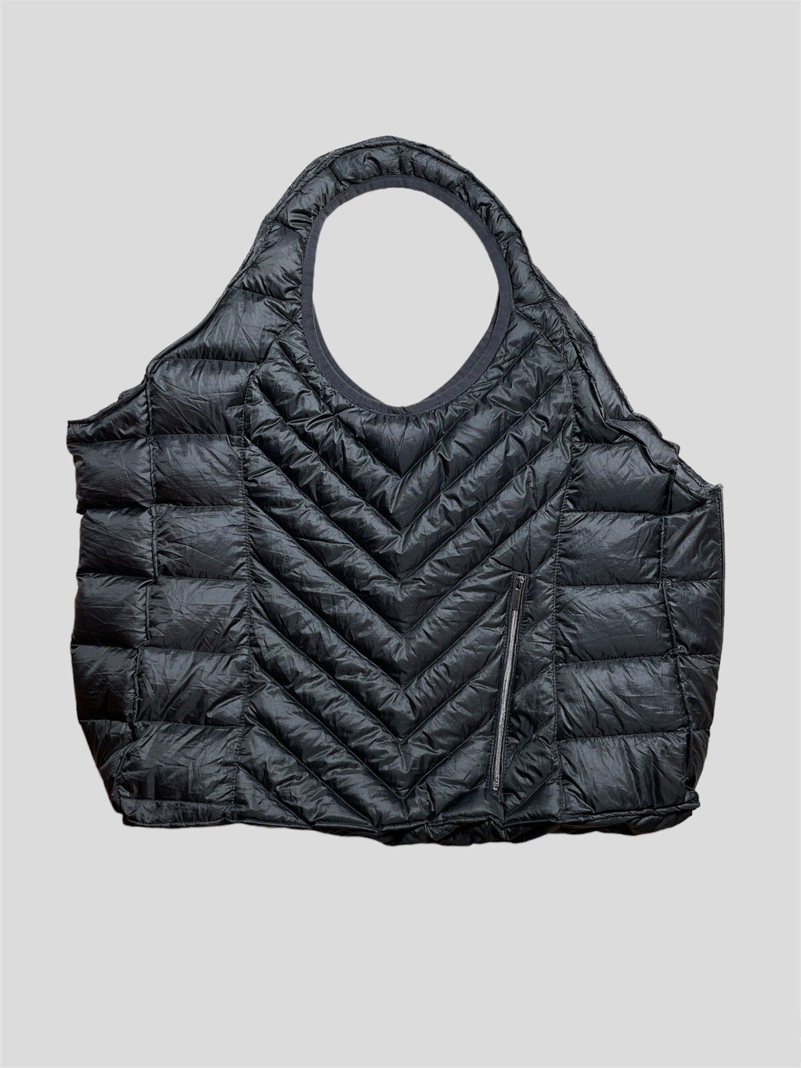 - Puffer bag super lightweight reworked from a down vest, the handle of the bag used to be the armholes