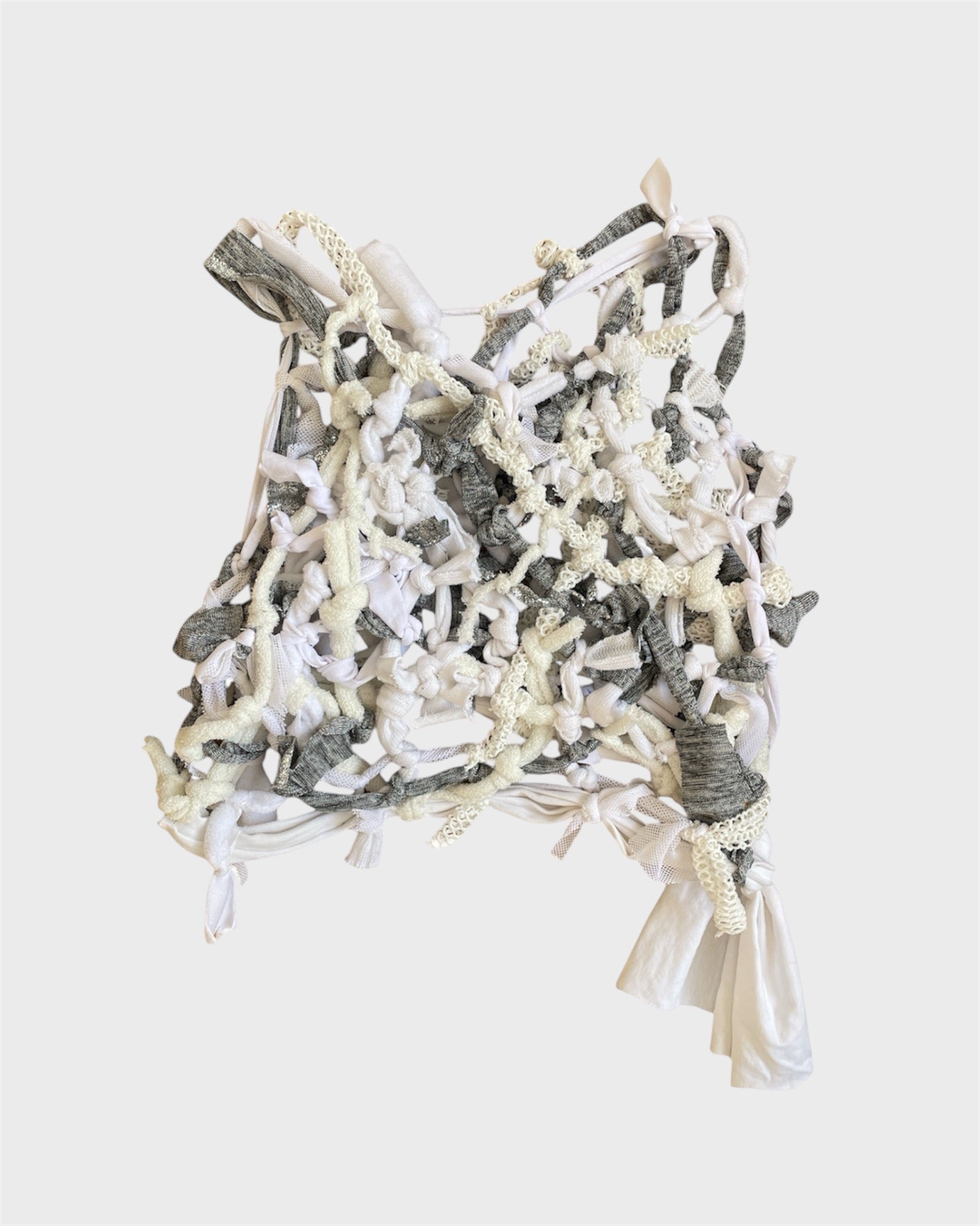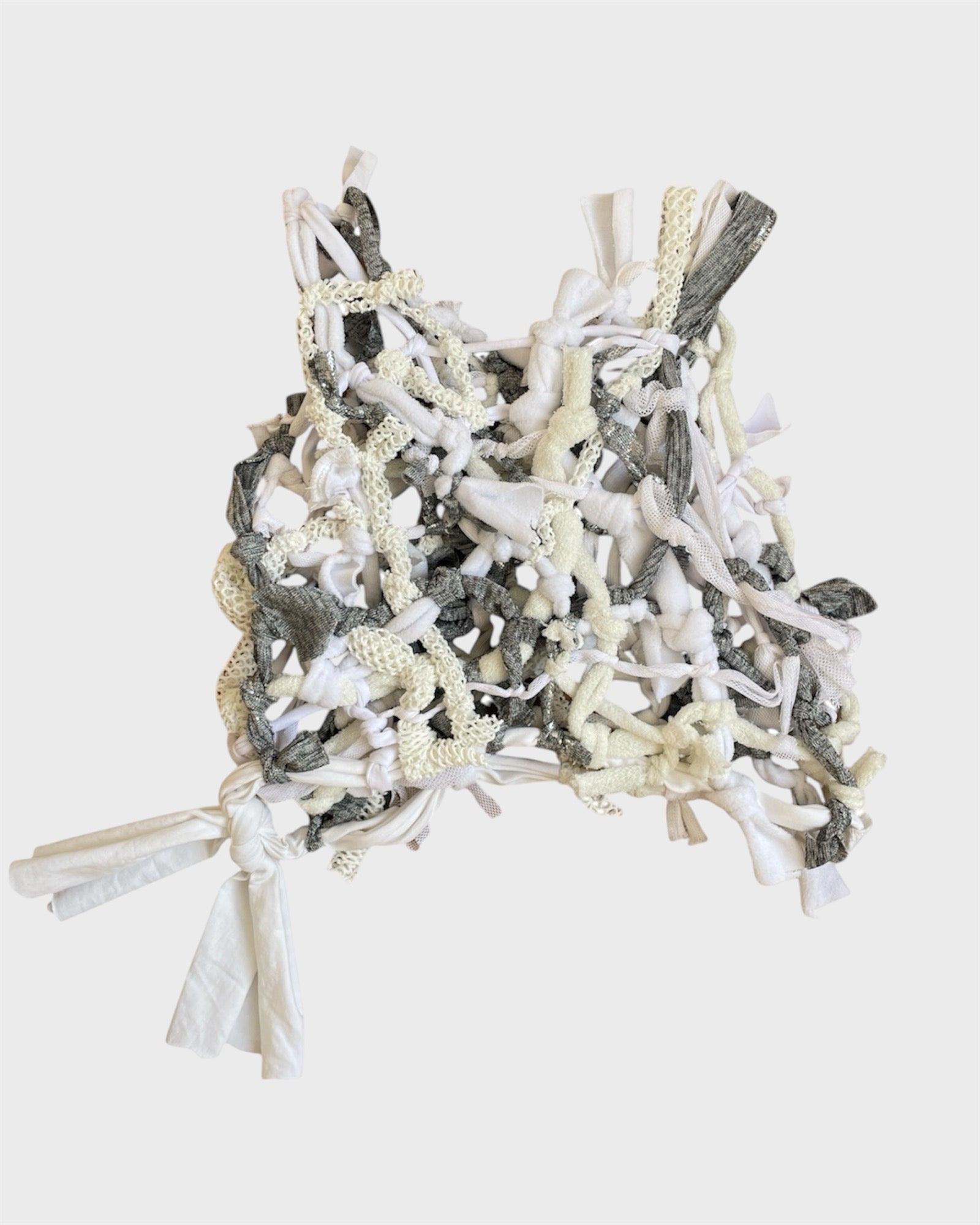 - The top is completely made from leftovers. Scratches from former projects have been kept, cut in stripes and knotted together into this beautiful one-of-a-kind piece