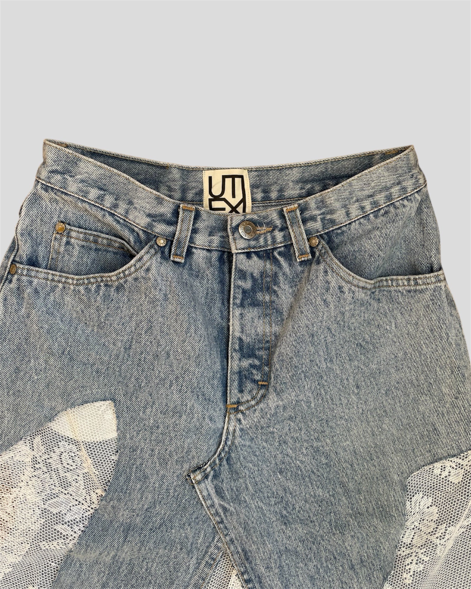 - Fabric: denim (100% cotton) and lace (100% polyester)