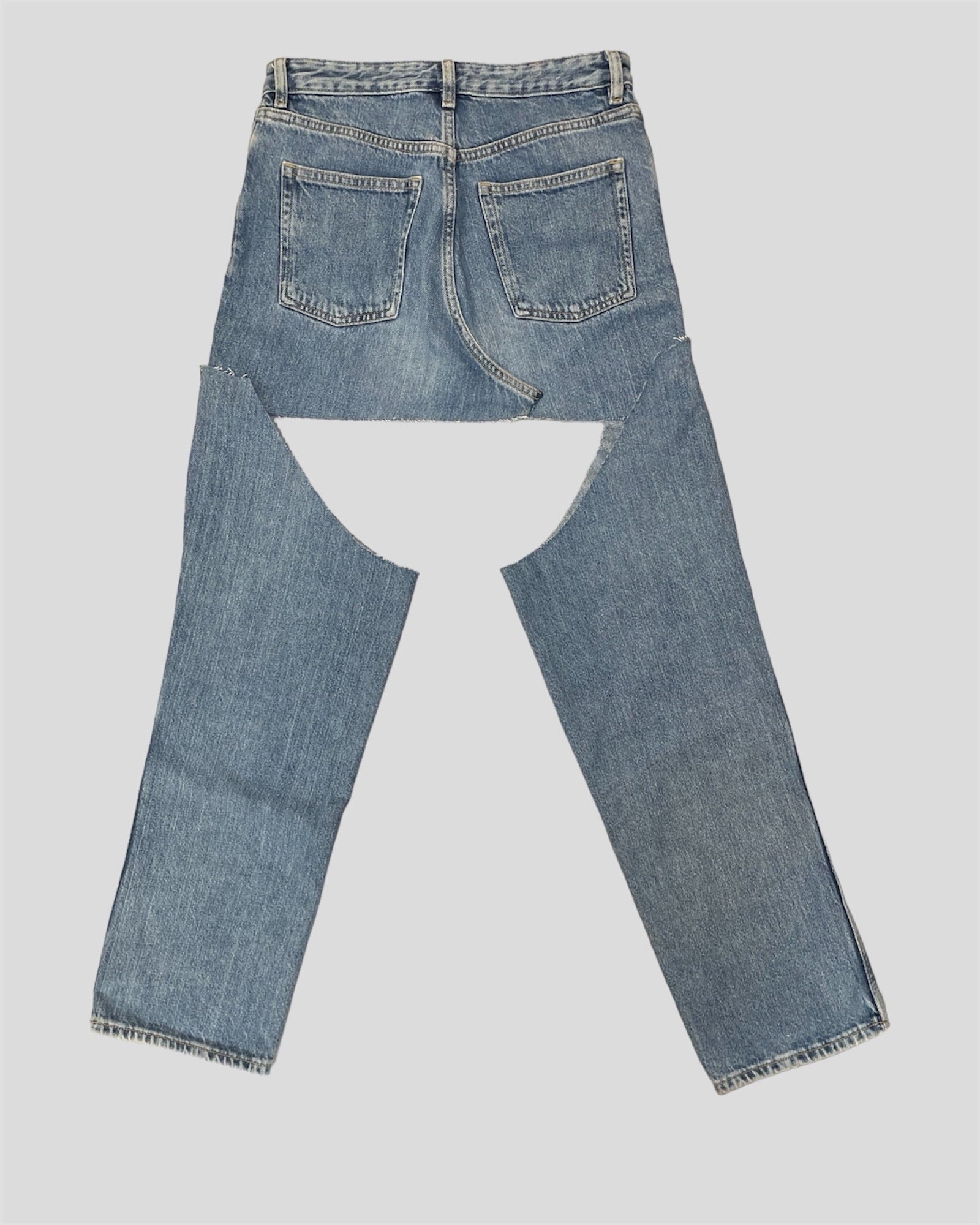 - Upcycled from pre-loved materials: A whole pair of old jeans used to make a skirt with removable legs.