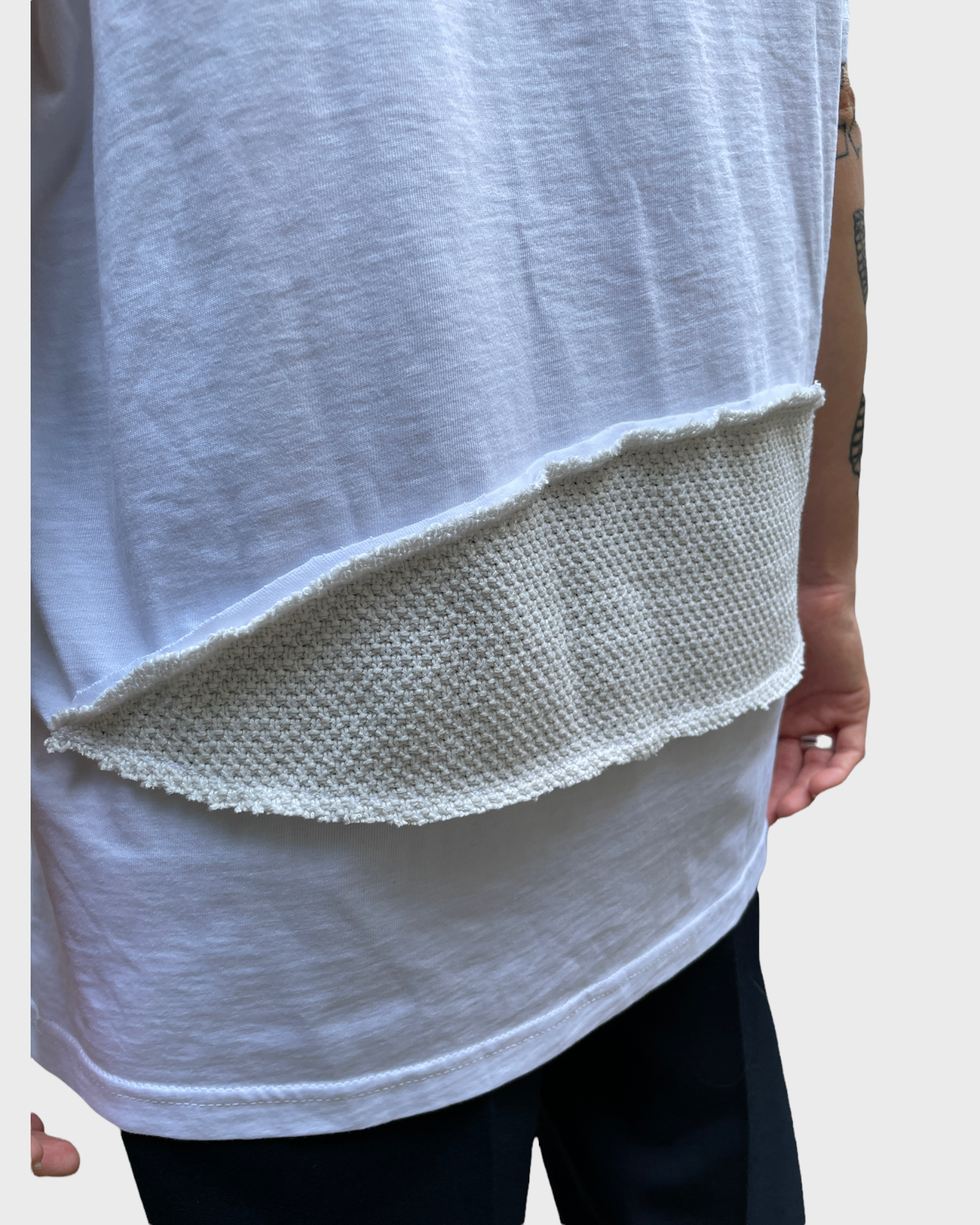 - Reworked white tee with knit details