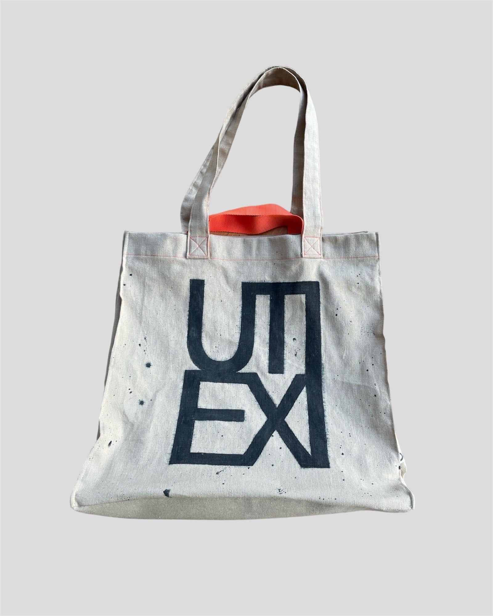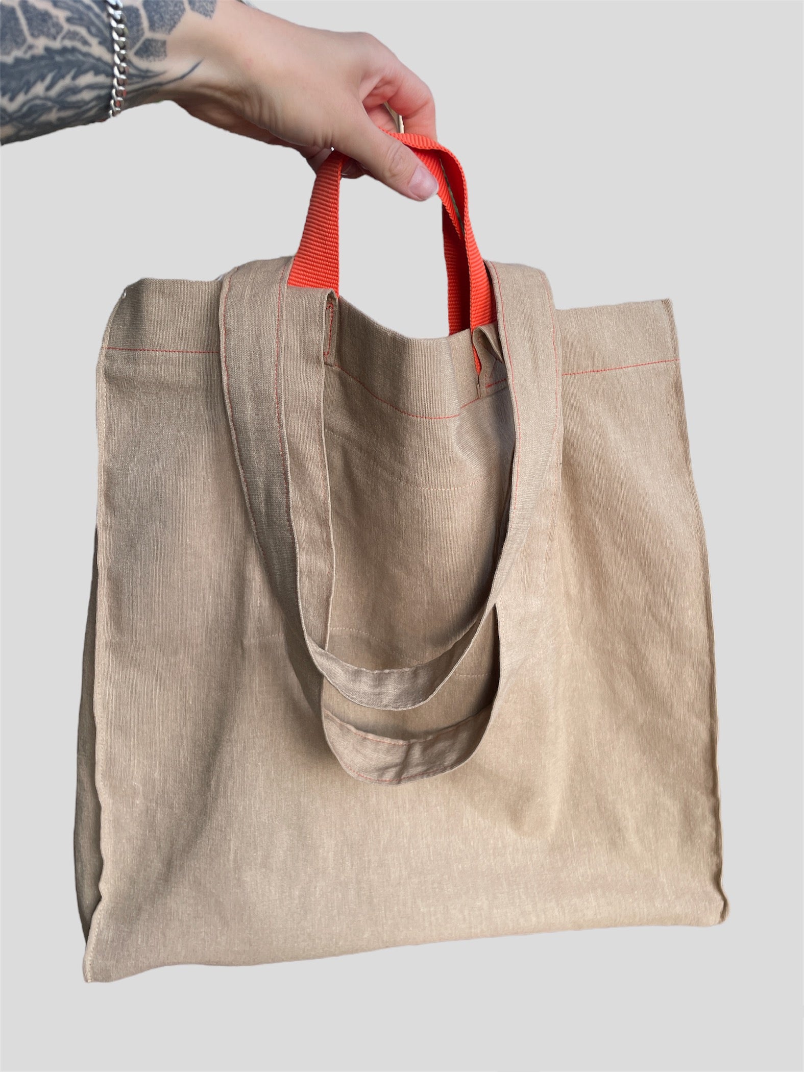 - Big shopper bag made from jute material with hand-painted logo and sparkles on the front